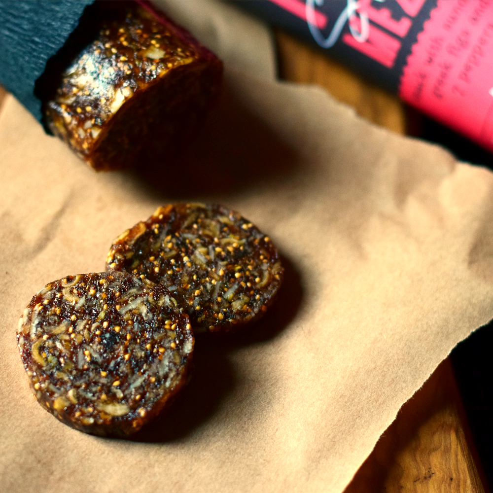 • Ingredienser: Fikonmassa (86 %), MANDELspån, blandning av 7 pepparsorter (1,6 %), mald anis, kanel, kryddnejlika, fleur de sel från Messolonghi.